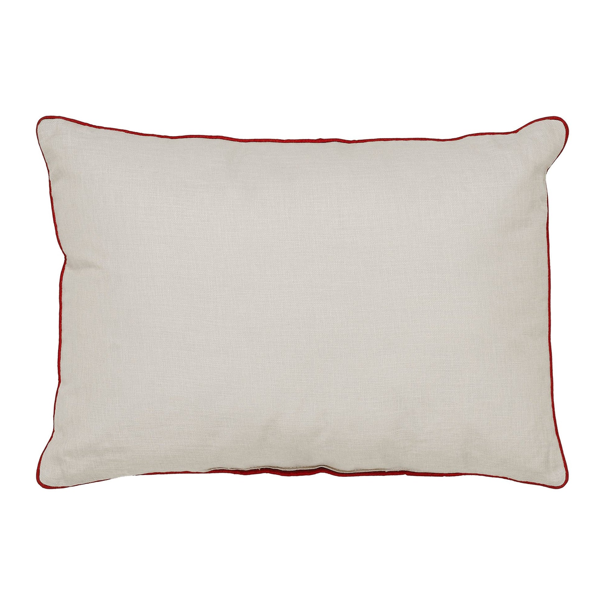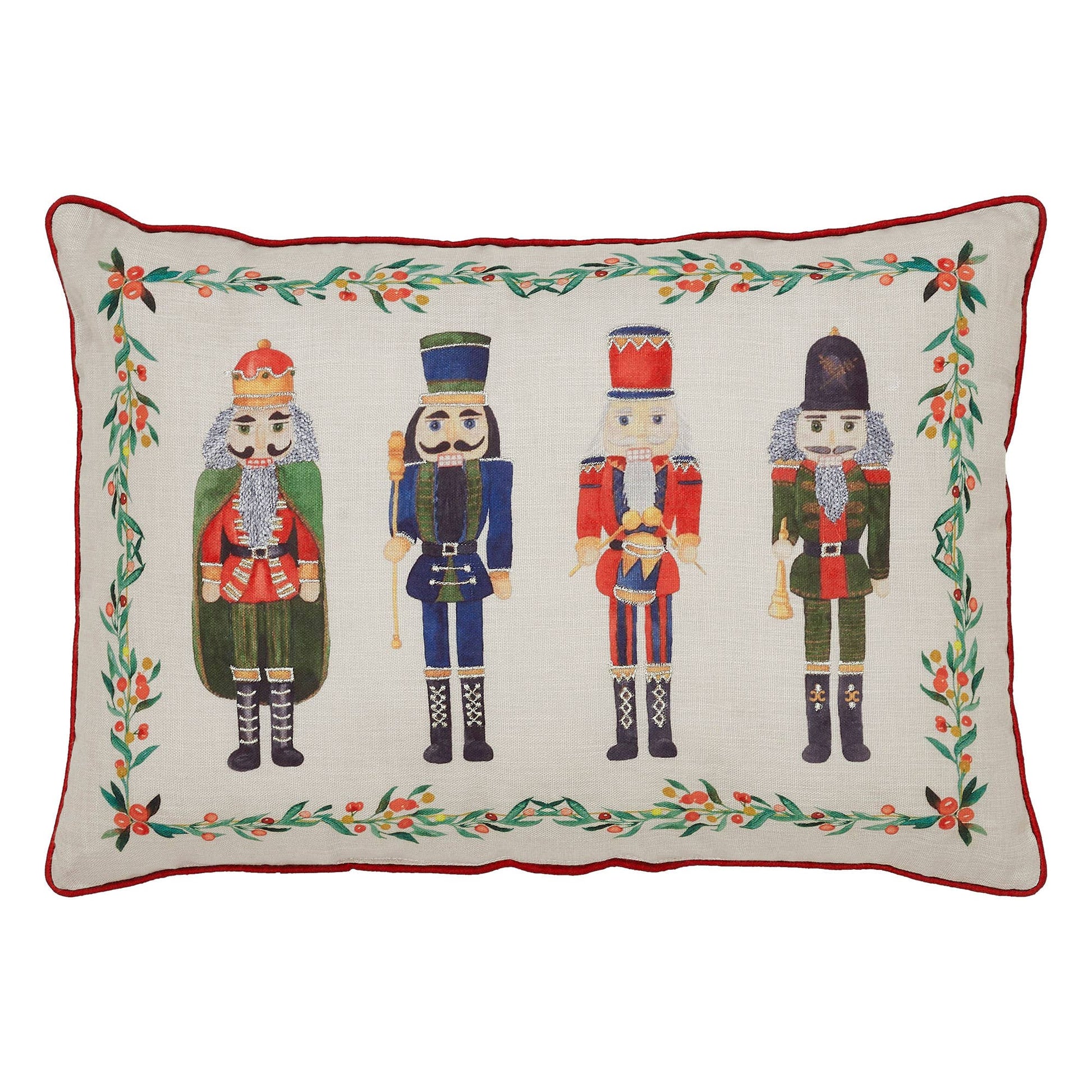 Add a festive touch of nostalgia to your home with this rectangular pillow featuring four classic nutcrackers in vibrant green, red, and blue suits, each brimming with holiday spirit. Sized at 20"x11" and set against a warm crème backdrop, the design is framed with printed evergreen branches and cheerful red berries, finished with contrasting red piping for a timeless look.